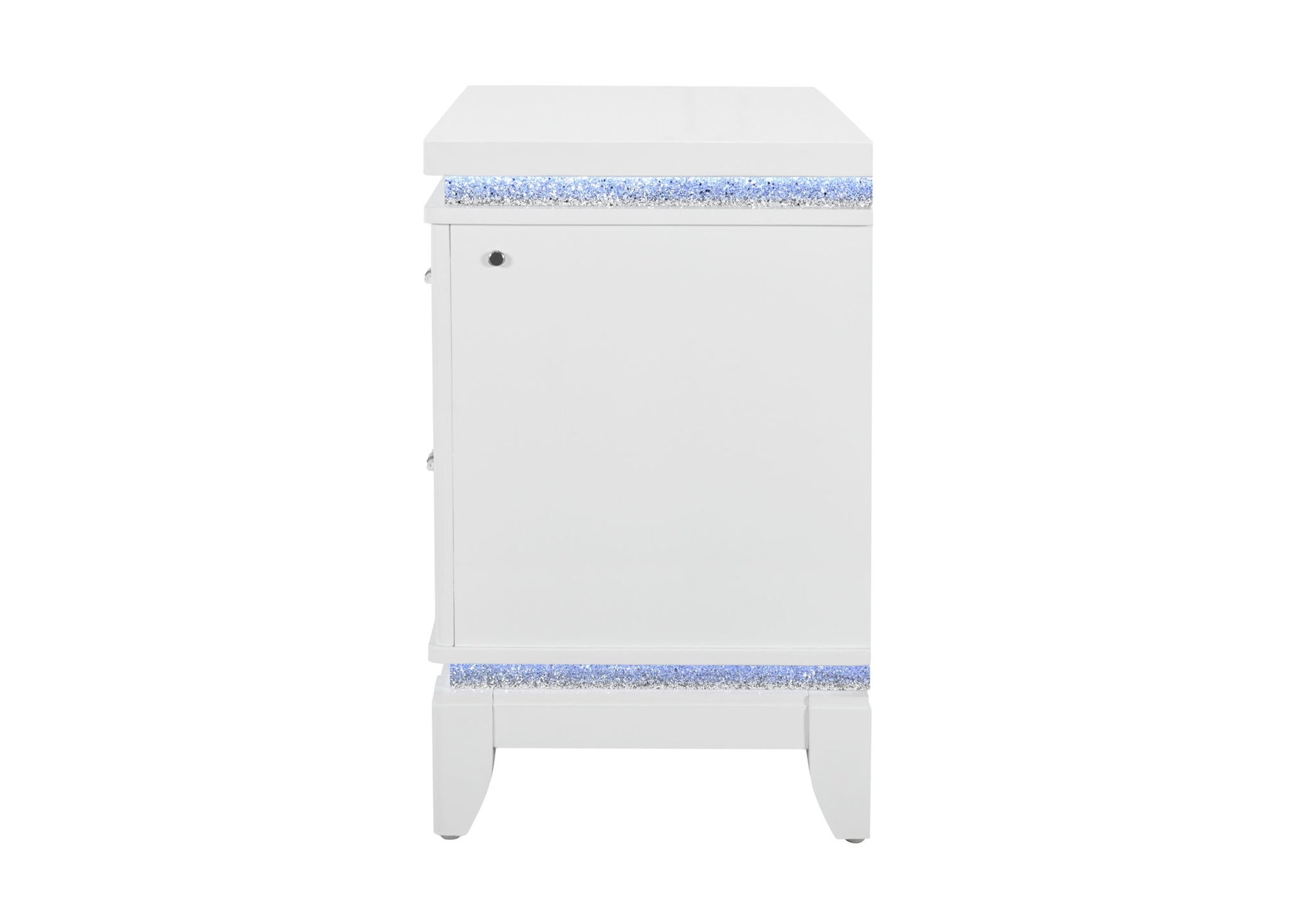 The Alina Nightstand is the perfect bedside companion, offering convenience and glamour in equal measure. With LED lighting and crushed glitter surfaces, it's a nightly spectacle, while the silver glam drawer fronts ensure your essentials are housed within reach, and in grandeur.