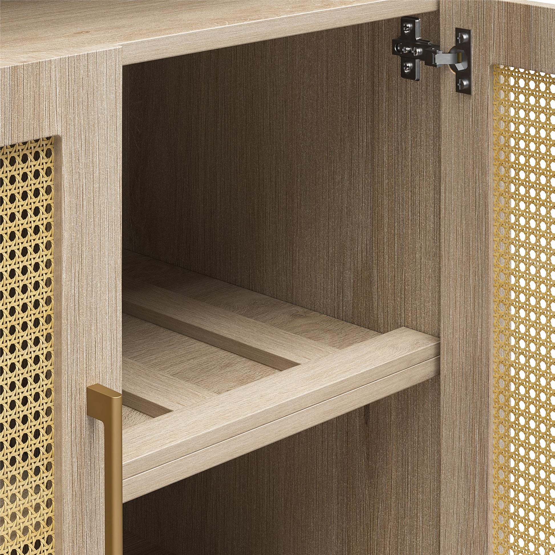 - Bohemian Arched Design: Features an elegant arched profile with faux rattan doors and light oak woodgrain finish for a sophisticated look in any room