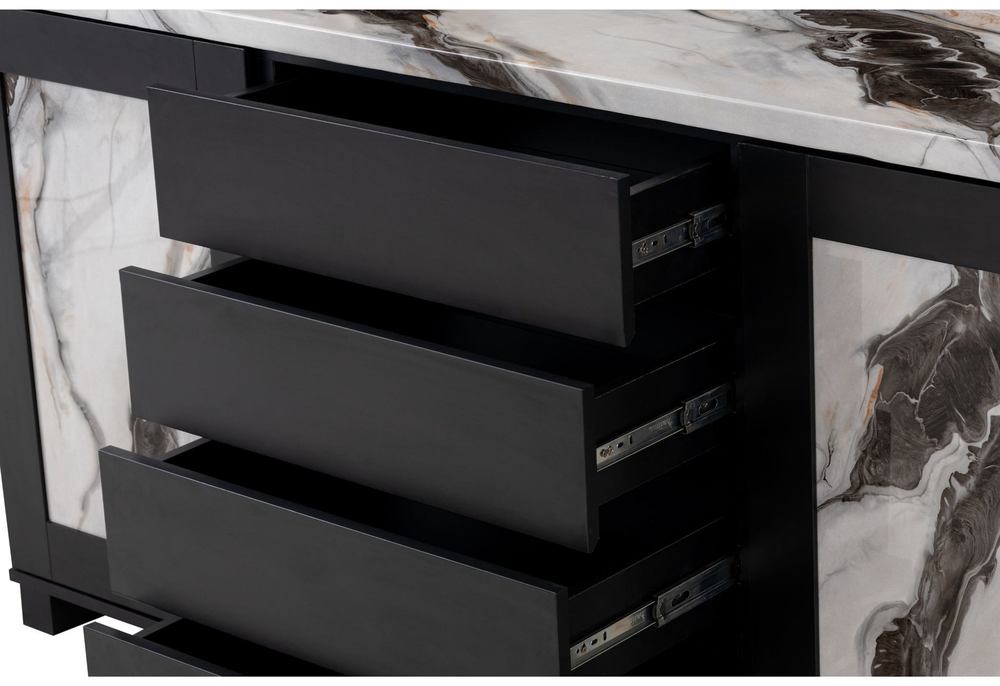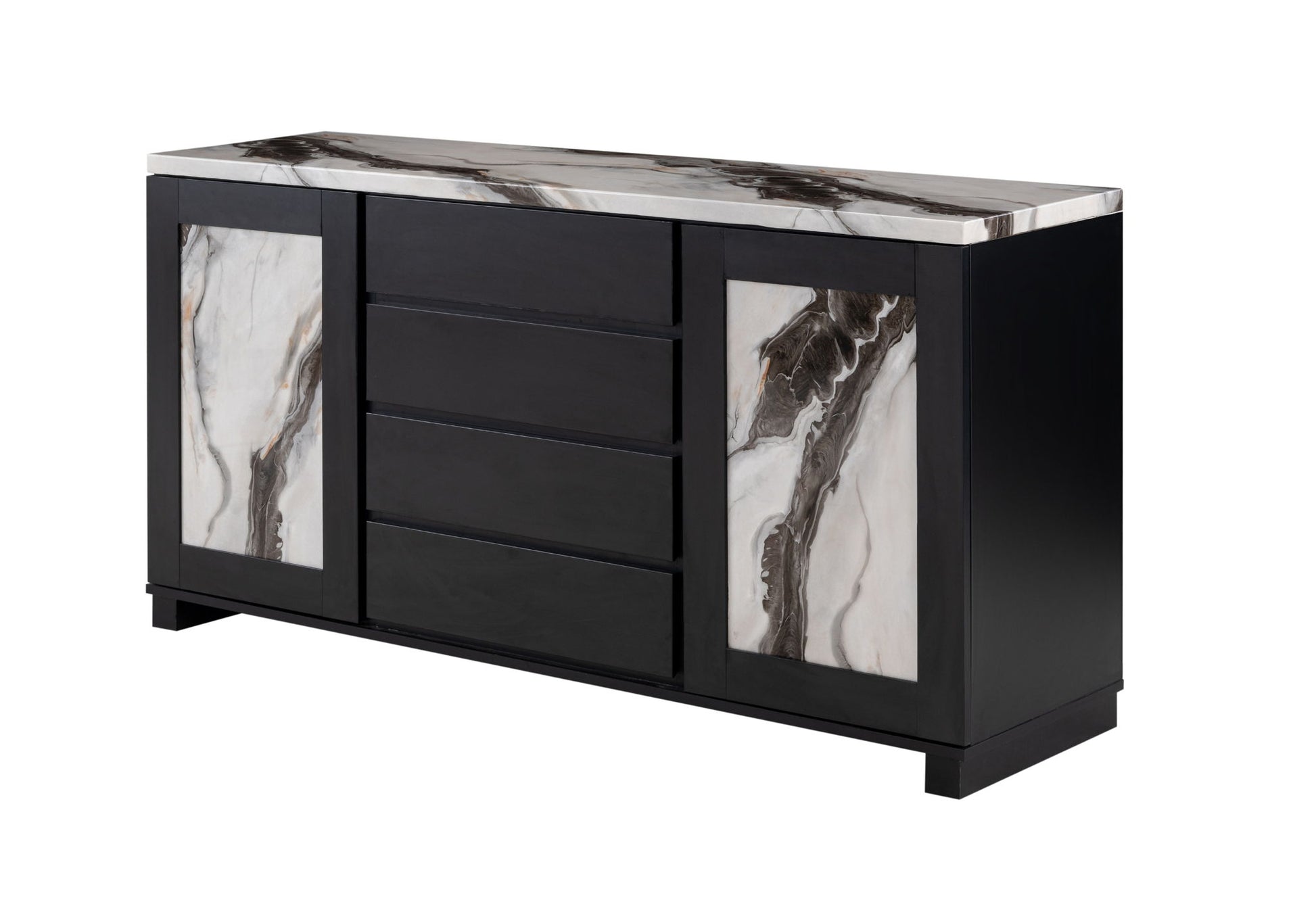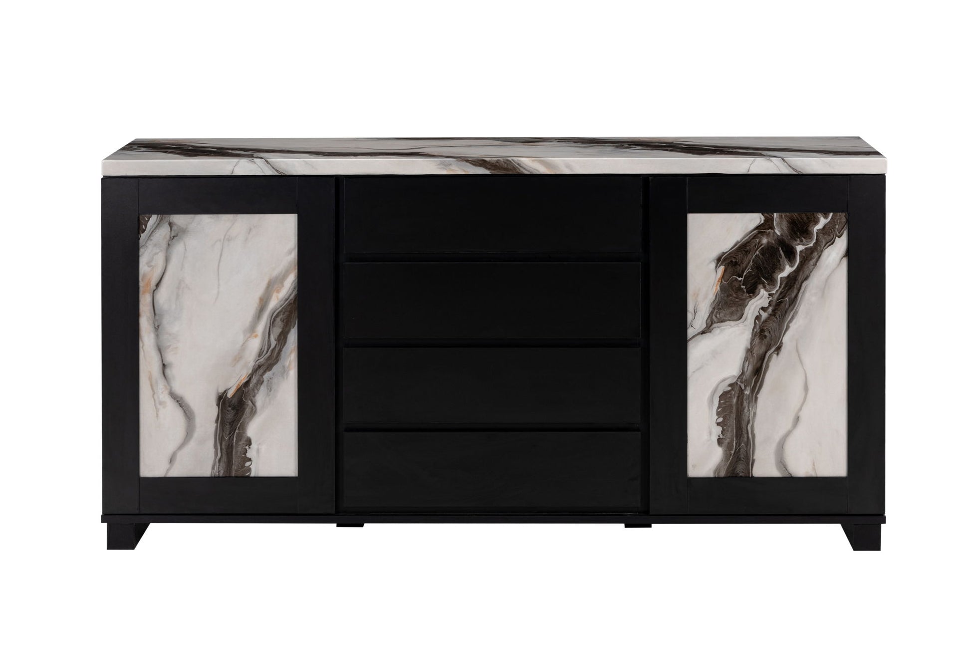Channel an air of sophistication with the D12 Buffet in your dining room. All your guests will admire the two unique faux marble doors that hide games for the party, dishes for dinner. Four attractive drawers with cutout handles are perfect for holding bar accessories or utensils. The Faux Panda Marble top is both durable and stylish.