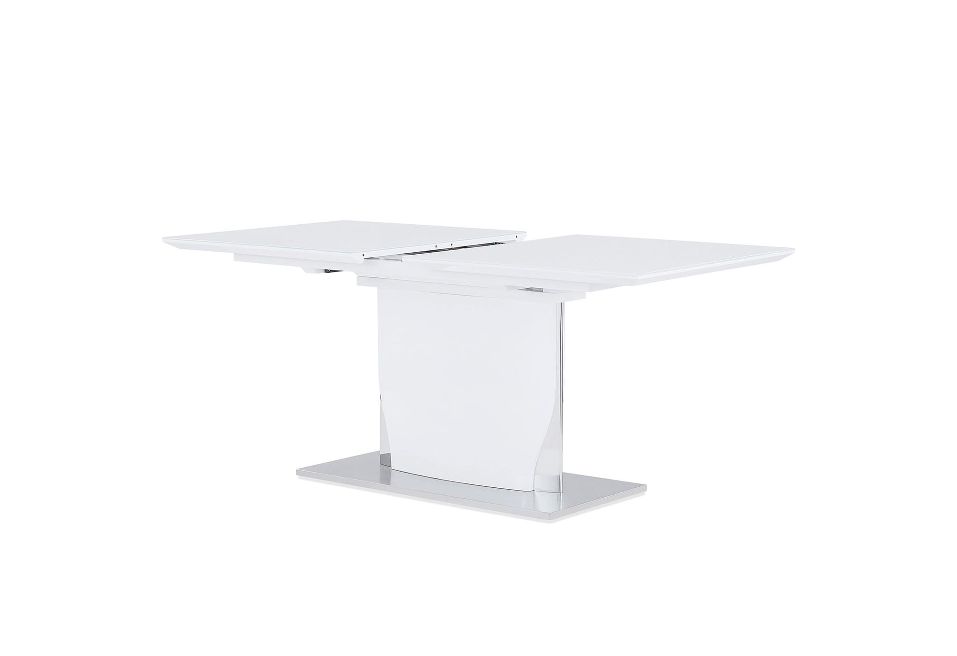Enjoy cutting-edge and minimalist style that's as eye-catching as it is practical for your contemporary dining space. A high gloss white finish with brushed stainless steel accents is sleek and on-trend. The glass top over white high gloss wood extends from 63in to 87in to accommodate all of your guests, and the self storing butterfly leaf hides seamlessly just below the tabletop when not in use.