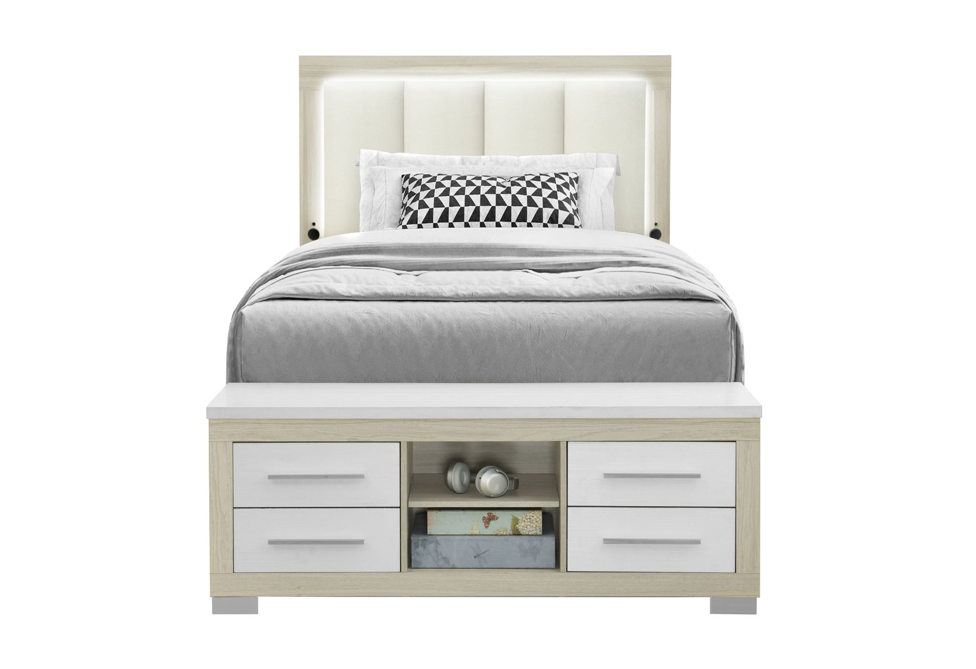 The Emma Full Bed is the centerpiece of this stunning collection, blending modern elegance with unparalleled functionality. The padded white upholstered headboard features an LED light and USB ports for added convenience, perfect for reading or charging devices. With its ingenious all-around storage design which provides ample space for bedding, clothing, and more. The two-tone natural wood and white finish completes the contemporary look, making this bed a true standout in any bedroom.
