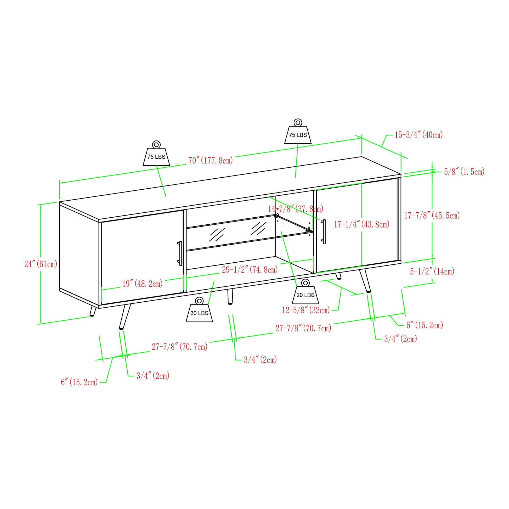 Mid-Century Modern 2 Door 70" TV Stand For 80" TVs With Glass Shelf - Birch