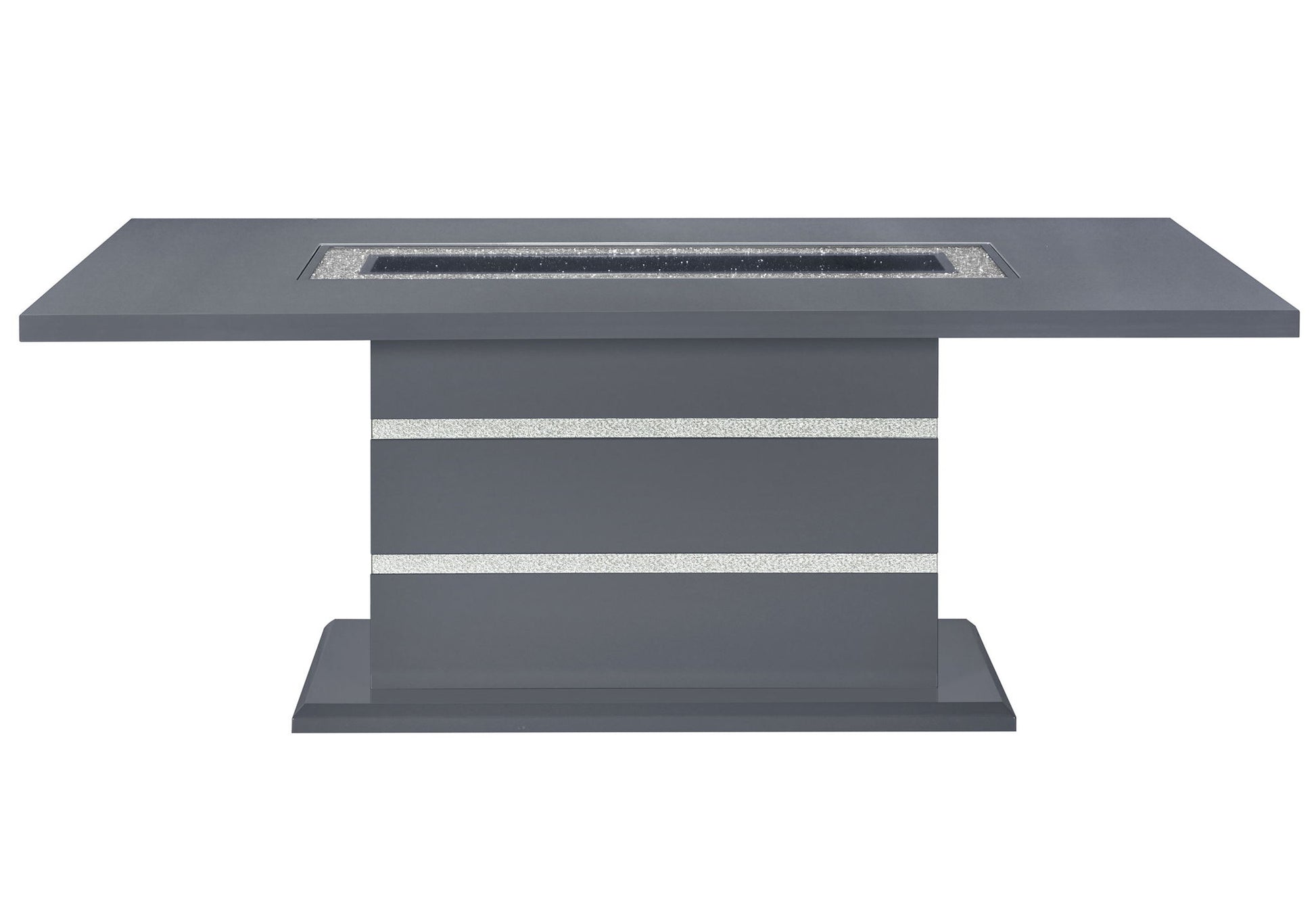 This dining table is a showcase example of how charm and a touch of elegance can dramatically change the look of your eating area. This table includes glitter detailing style elements with a sturdy construction and a high gloss finish with a clear glass inlay to round off the look. Constructed of MDF, Glass and Acrylic this dining table makes a bold statement. Finished in a Dark Grey and Silver with a center glass, rectangle shape and pedestal base you will have more than enough room to entertain and enjoy your dining experience.