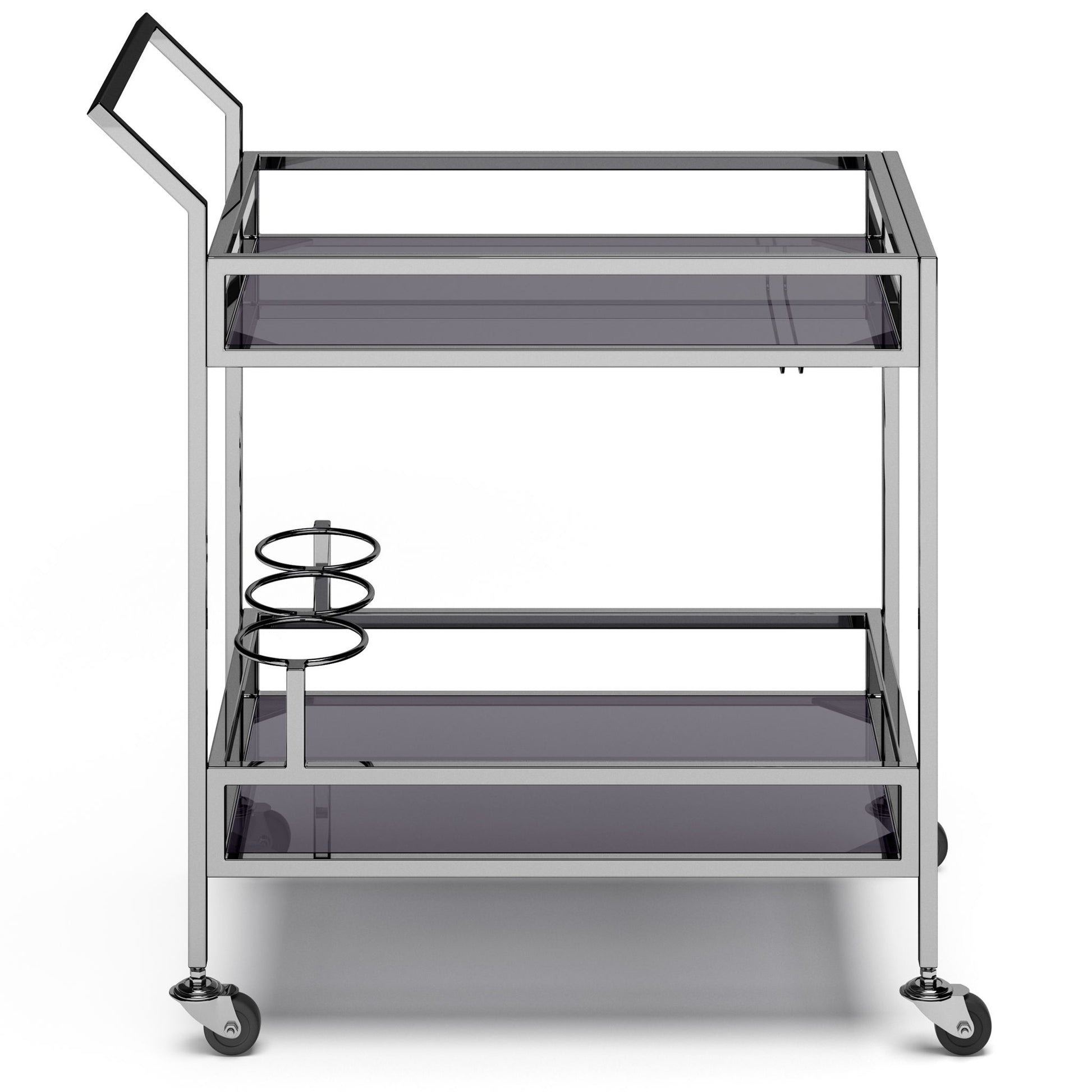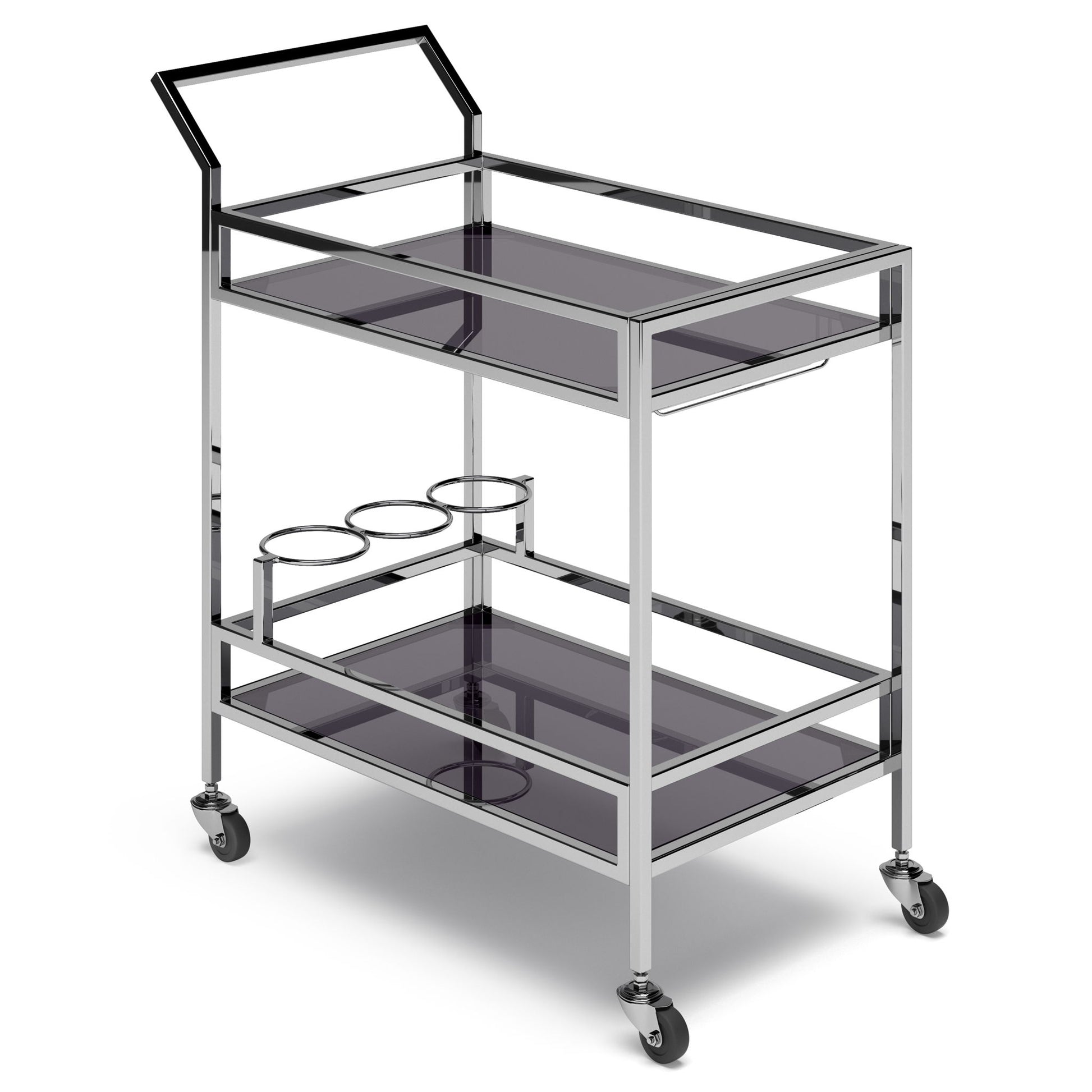 - Features Black toughened glass top and bottom shelves, one rack for hanging glasses, three rings for bottle storage, four caster wheels – two that lock and handle/pull